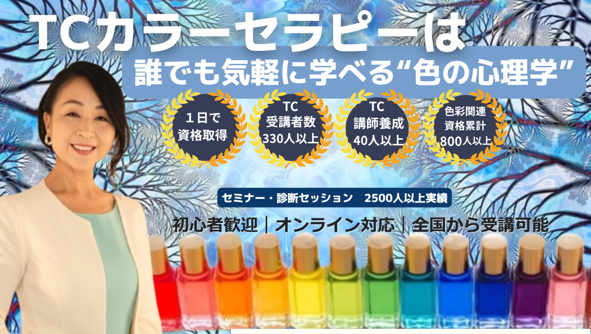 5時間で資格取得可能なTCカラーセラピスト講座や、1日で取得できる色彩心理講座をはじめ、癒しを仕事にしたい方や新しい自分を発見したい方を全力でサポート!