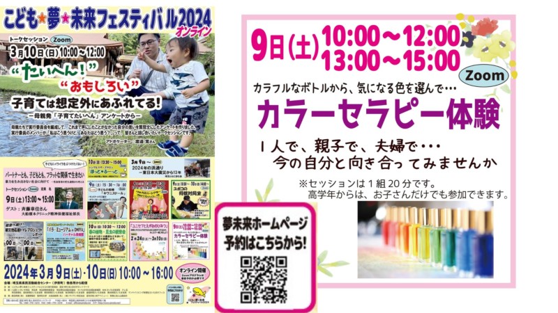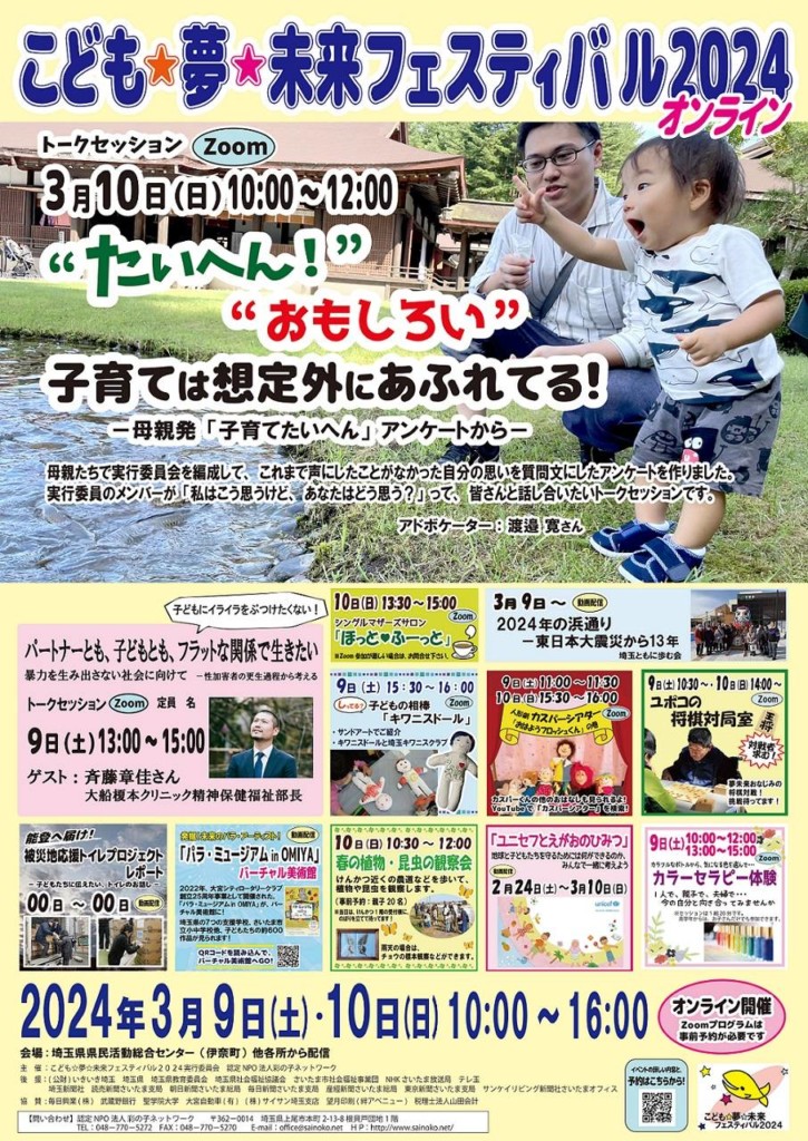 - 「こども☆夢☆未来フェスティバル2024」は、子育て支援のNPO法人「彩の子ネットワーク」が主催するオンラインイベントです。
