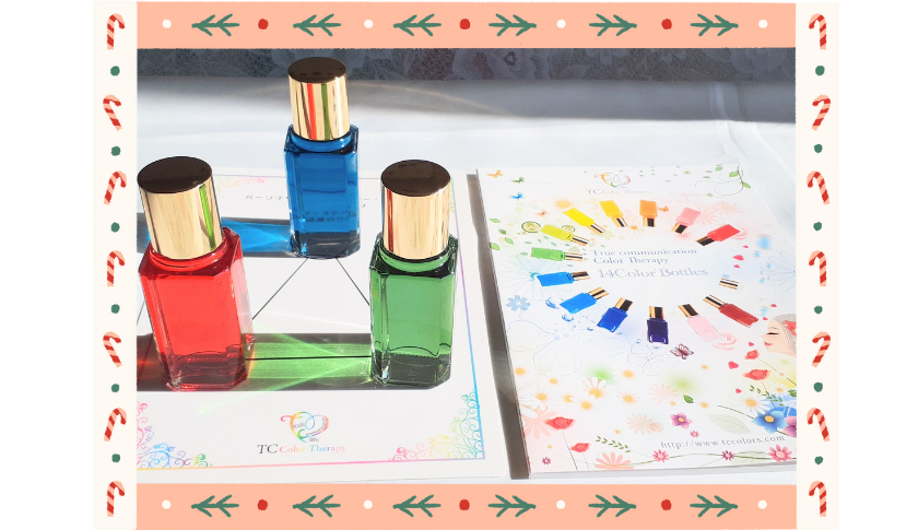 TCカラーセラピーとは、14本のカラーボトルと解説本(色の意味が書いてあるマニュアル)を使い、色のメッセージから自分の連想や感情を言葉にするコミュニケーションツの方法が学べます。