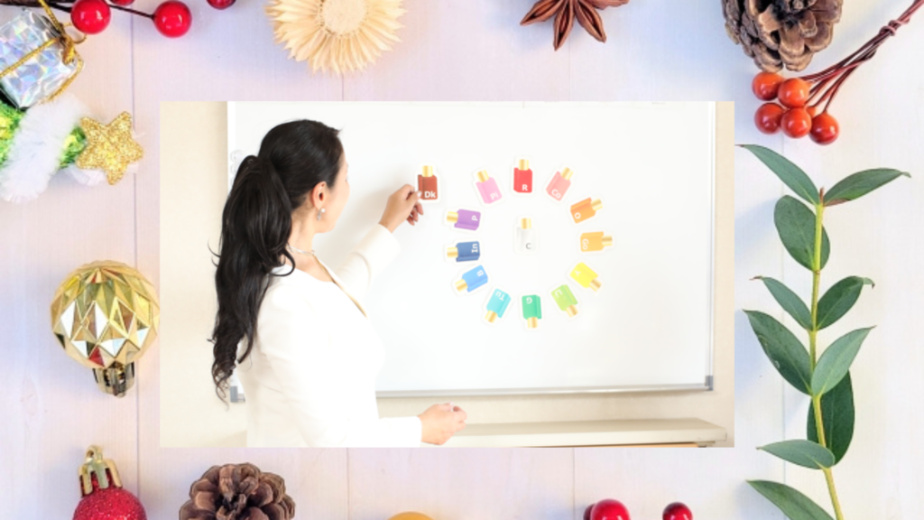 対面で受講する場合は、カラーボトルや色彩言語カードなどの教材を直接手に取って、色の感覚を体感できます。